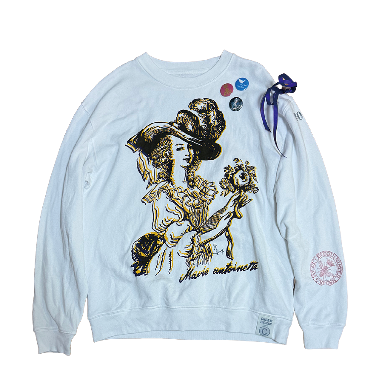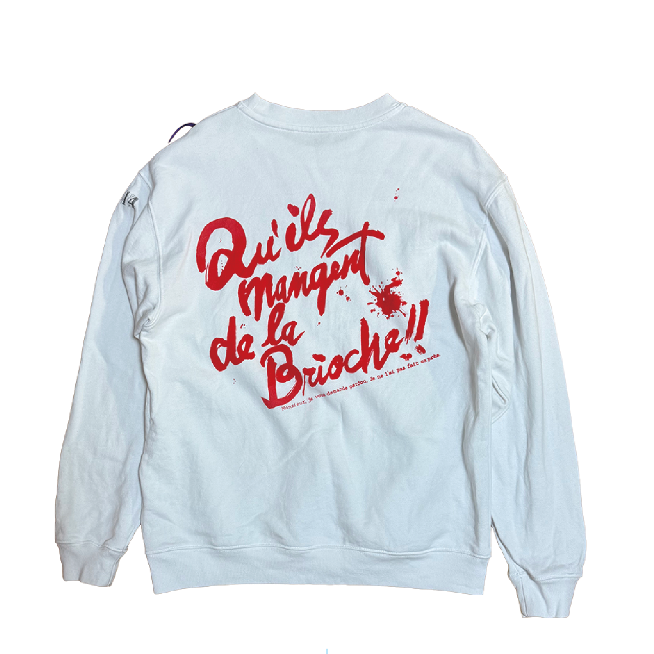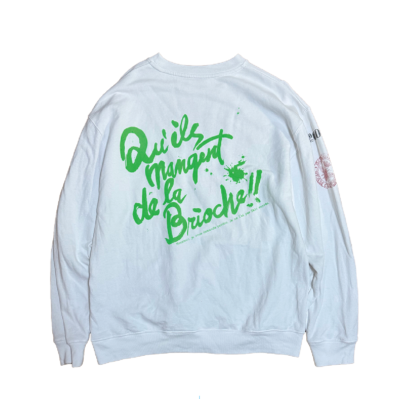 バックプリントに大きく「 Qu'ils mangent de la brioche‼︎」(ブリオッシュを食べればいいじゃない‼︎)を殴り書きのような文字で。その下に小さく「Monsieur, je vous demande pardon. Je ne l'ai pas fait exprès.」(申し訳ありません。わざとではないのです。)のふたつのスローガン。